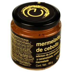 Aderezo de julianas de cebolla condimentada y caramelizada, untable y con apariencia de mermelada.